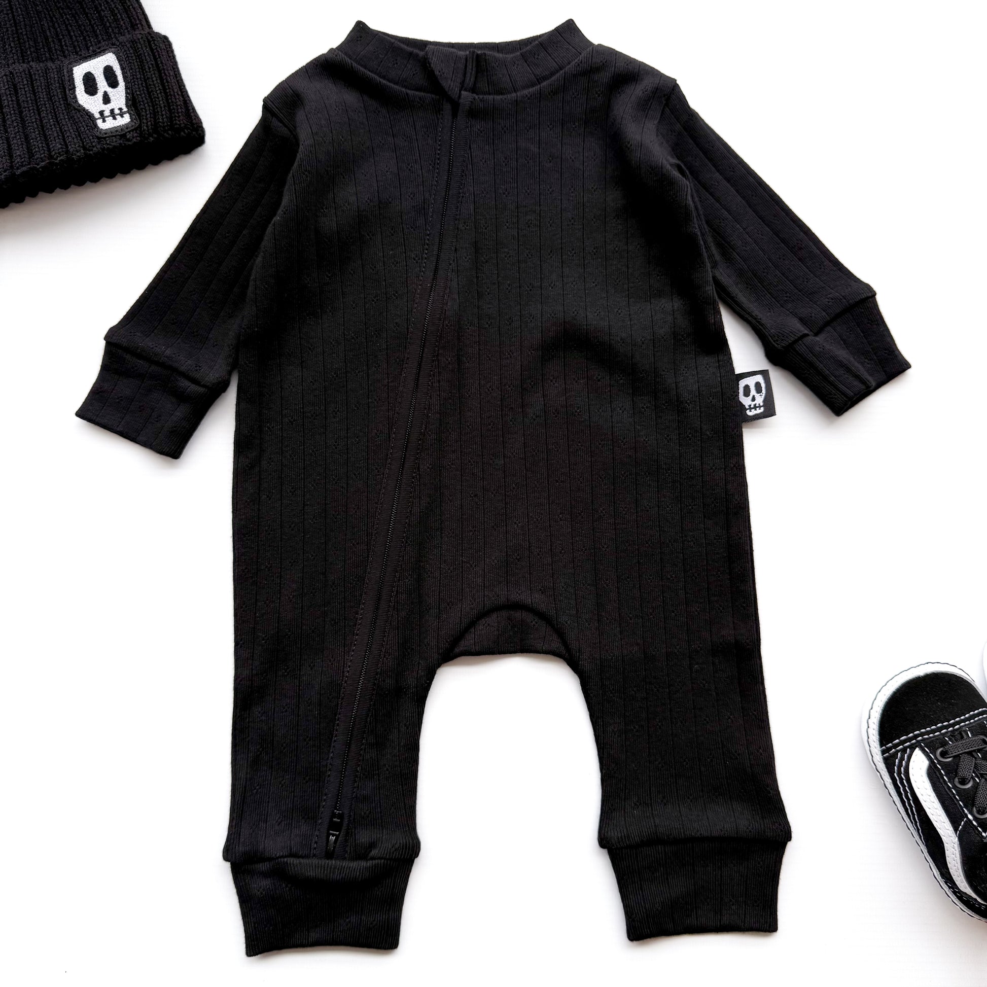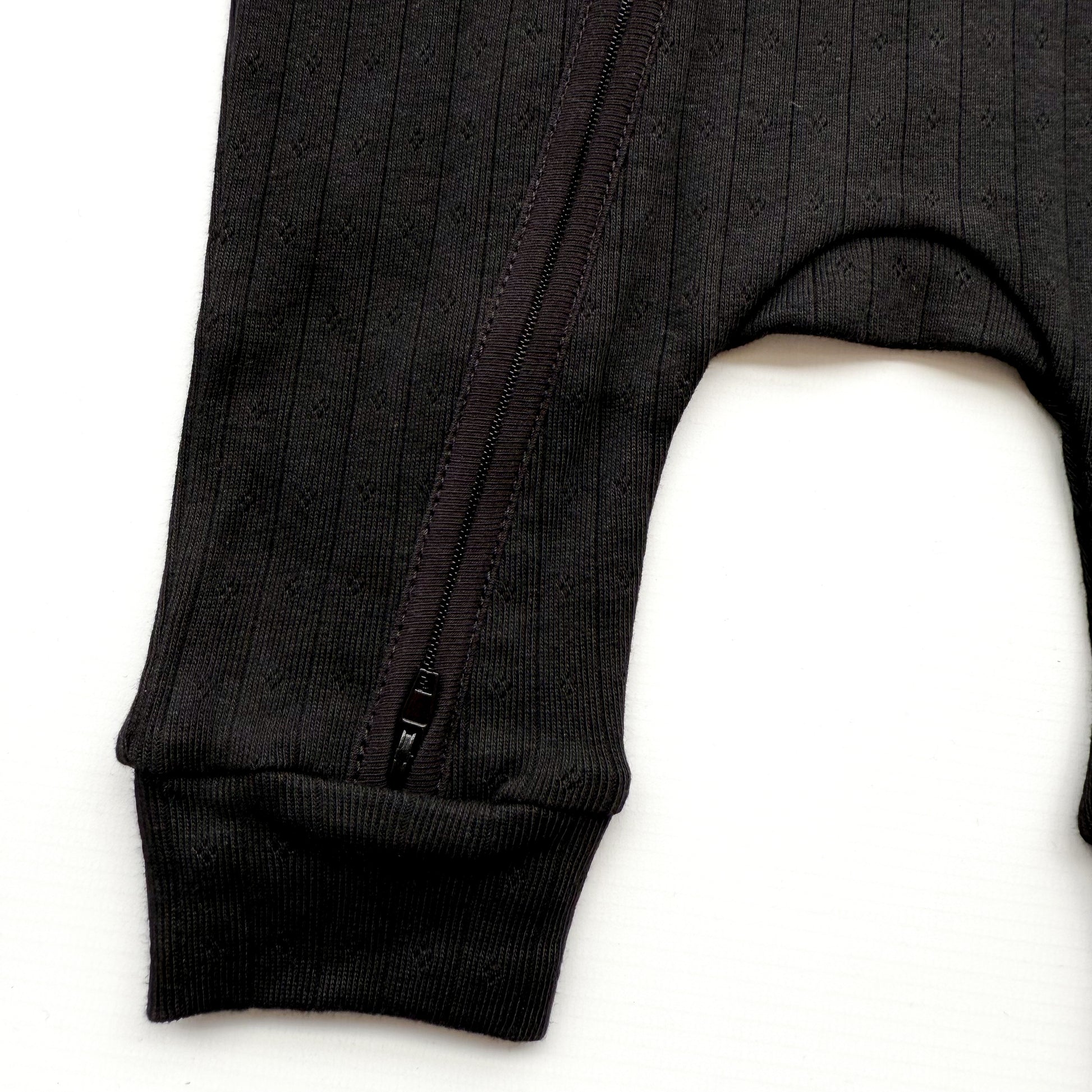 BABY POINTELLE BLACK ZIP UP FOOTLESS ROMPER