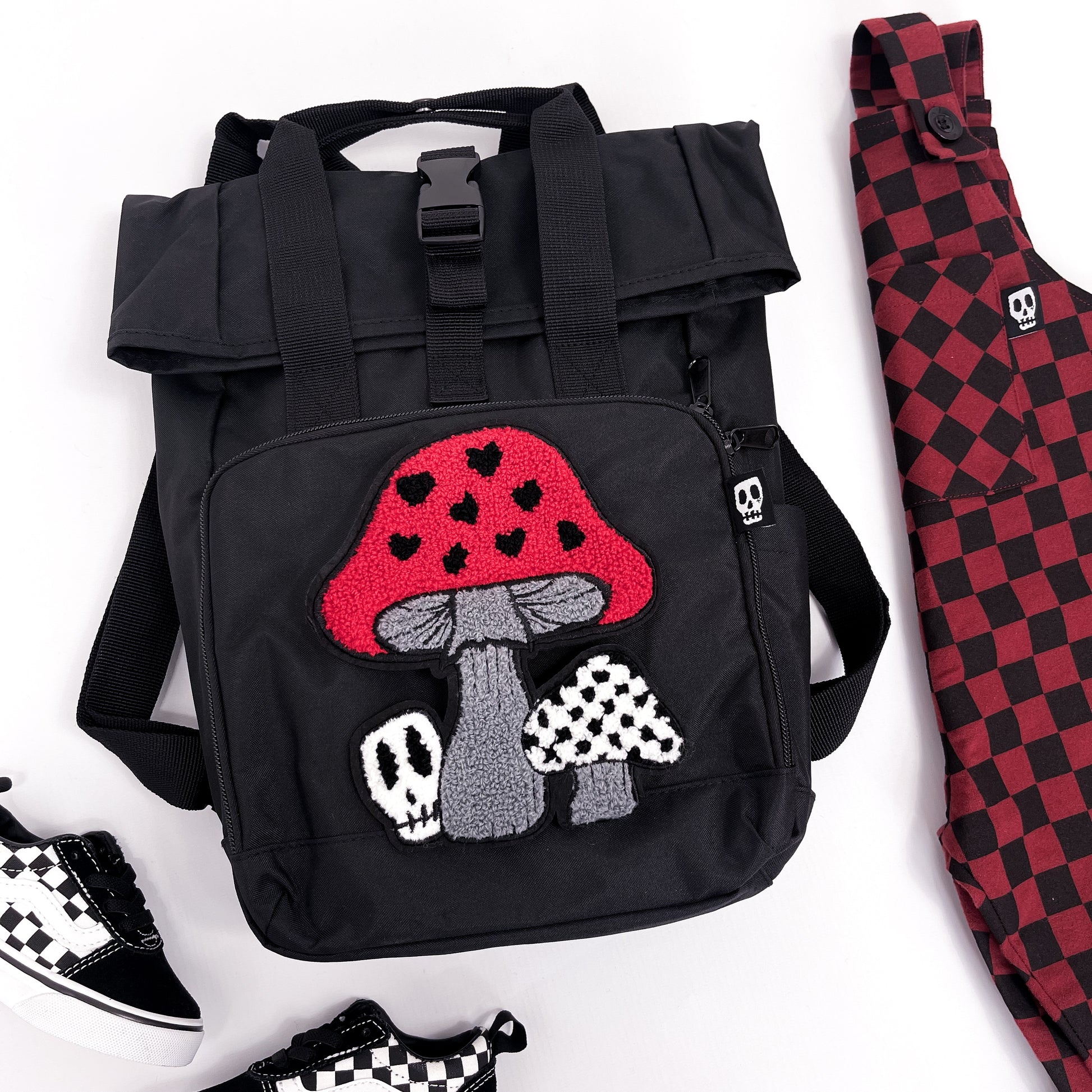 RED TOADSTOOL SKULL PATCH ROLL TOP BACKPACK BAG